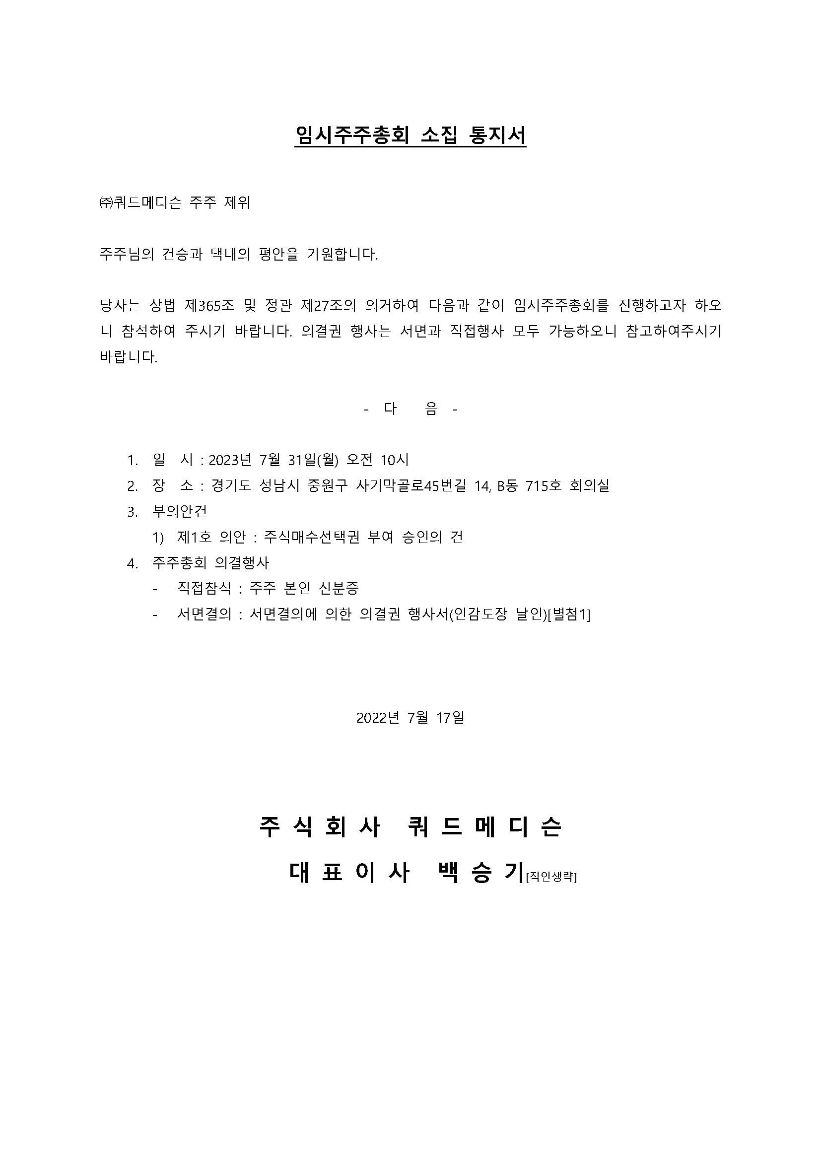 임시주주총회 소집 통지서